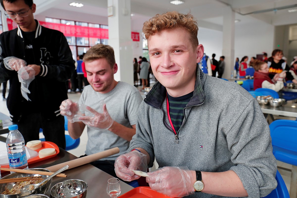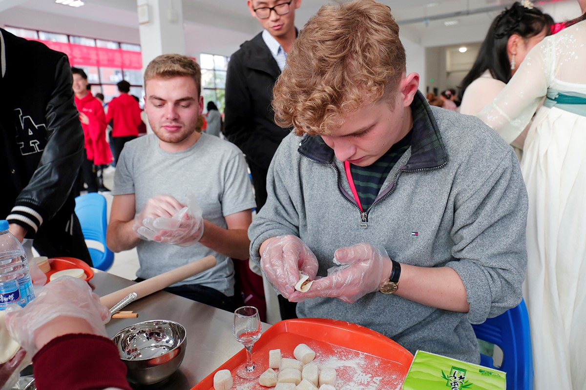 食堂楼上一字排开的桌前,那些黑皮肤、白皮肤、黄皮肤的手操着擀面杖,认认真真在面团上推压着,擀好了边缘蜿蜒曲折、具备多种几何形状的饺皮后,他们小心翼翼将饺皮置于手心装入肉馅,轻轻合拢,学着志愿者的样子在封口处捏出皱纹。每个参与者都兴致勃勃,细细体味着中华饮食文化的迷人之处。
