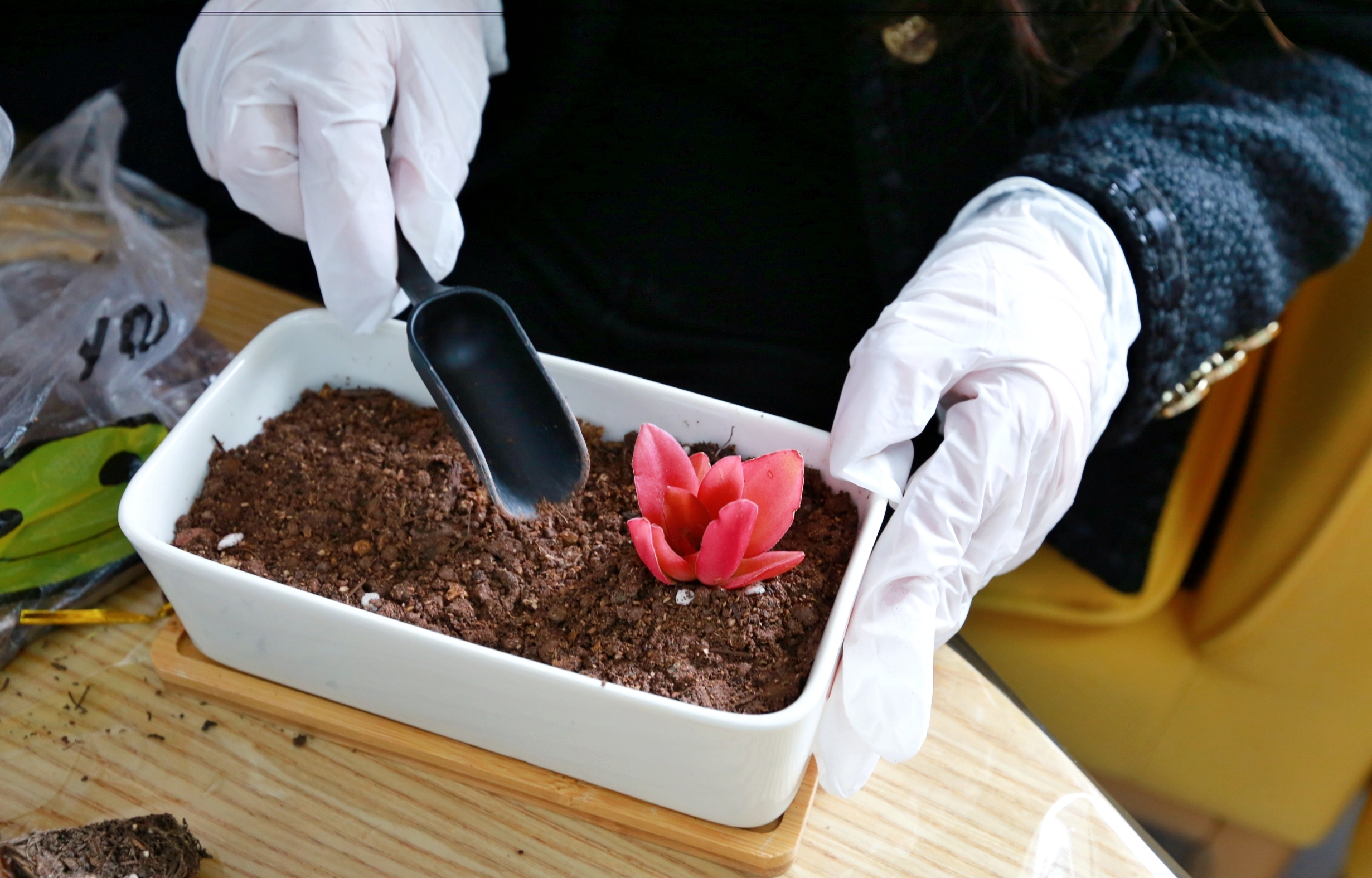 活动现场温馨雅致,花艺老师从盆栽花卉的种植方法和步骤,日常养护及注意事项等多方面讲解知识。