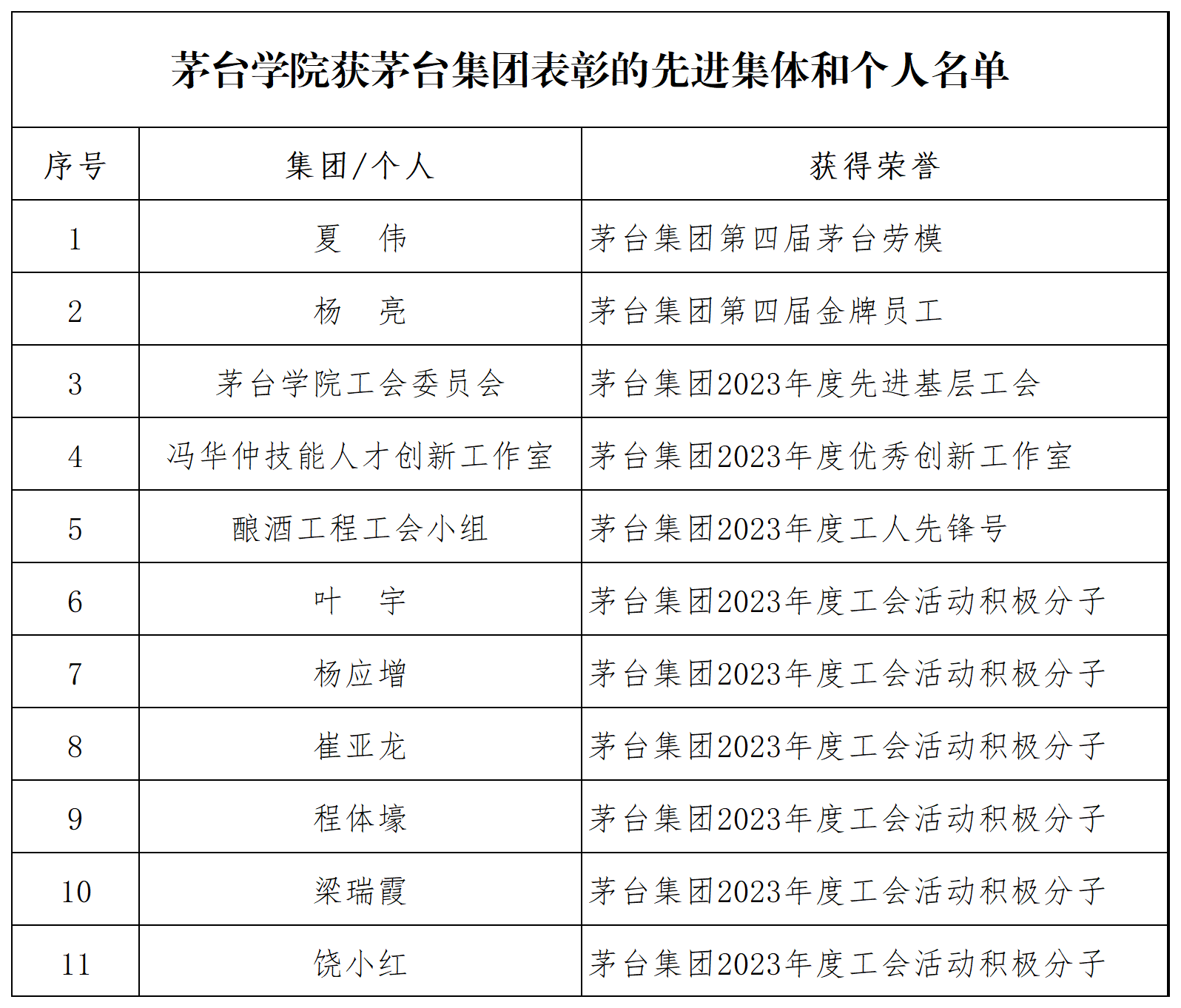 5月10日,根据茅台集团相关表彰决定的文件,taptap点点体育资源环境系教师夏伟获茅台集团第四届茅台劳模,酿酒工程系教师杨亮获茅台集团第四届金牌员工,taptap点点体育工会委员会获茅台集团2023年度先进基层工会,冯华仲技能人才创新工作室获茅台集团2023年度优秀创新工作室,酿酒工程工会小组获茅台集团2023年度工人先锋号,多人获茅台集团2023年度工会活动积极分子。