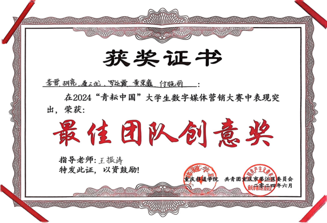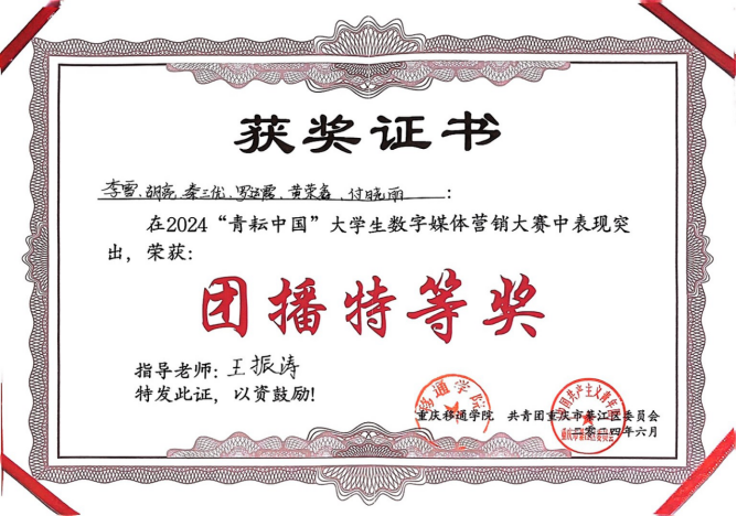 近日,2024“青耘中国”大学生数字媒体营销大赛总决赛暨颁奖典礼在重庆举行,点点体育“黔乡农韵队”成功斩获团播特等奖及最佳团队创意奖。