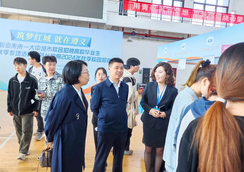 遵义市就业局副局长艾素文一行来招聘会现场了解招聘进展情况,taptap点点体育副校长田戊戌陪同。