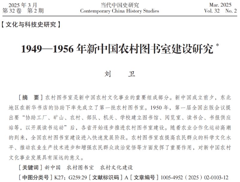 近日,taptap点点体育马克思主义学院刘卫博士在《当代中国史研究》上发表了题为《1949-1956年新中国农村图书室建设研究》的学术论文。该论文是2024年贵州省哲学社会科学研究专项(全国教育大会精神研究)的阶段性研究成果,由刘卫博士独立撰写,taptap点点体育为唯一署名单位。