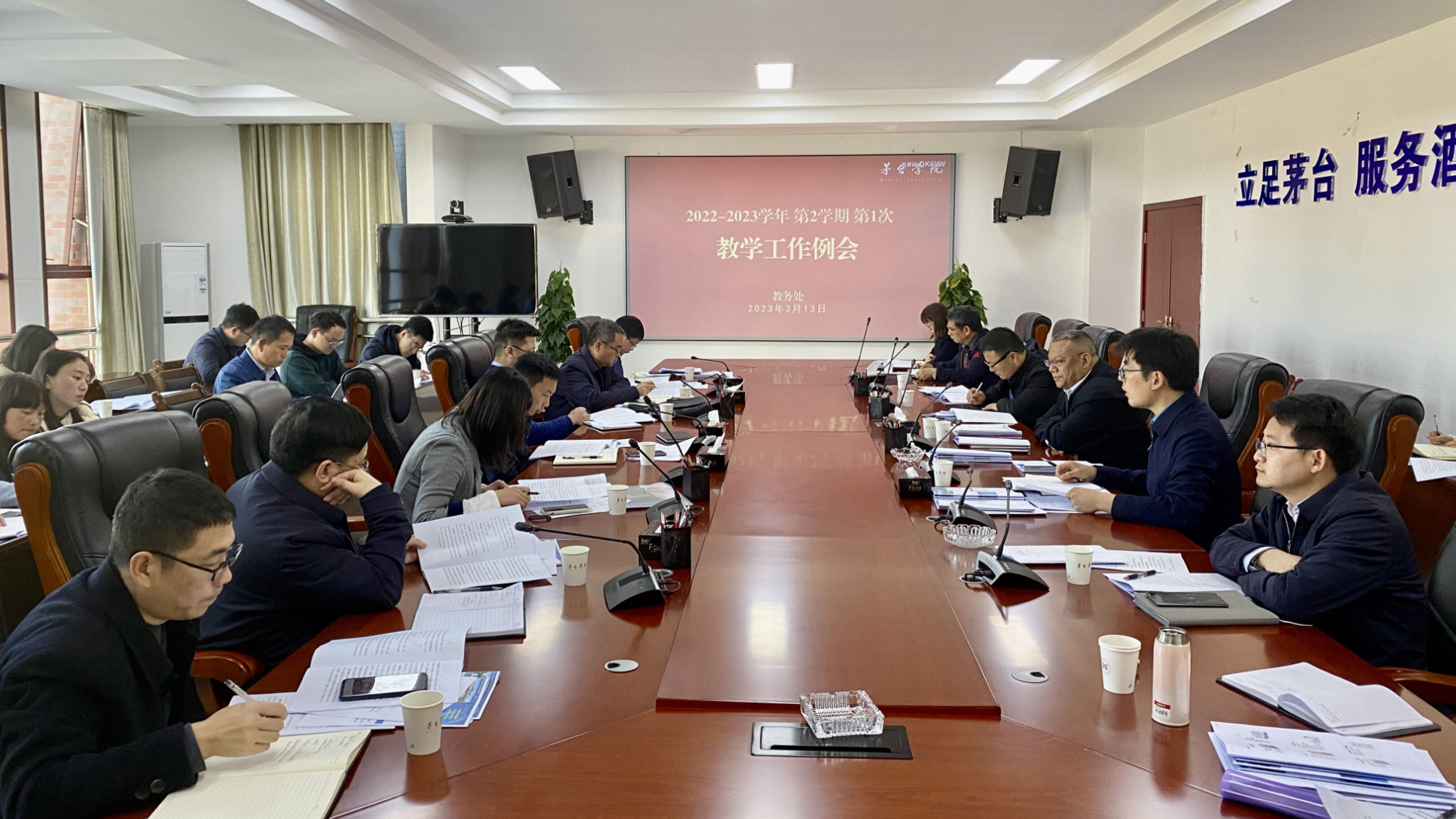 2023年3月13日,2022-2023学年第二学期第1次教学工作例会在行政楼二楼会议室召开,校长蔡绍洪、常务副校长李增驰出席会议并讲话,教务处处长张春林主持会议,各教学单位分管教学工作的领导、质量评估与监测中心负责人、相关工作人员、实验实训教学中心、各教学单位教学秘书及教务处相关人员参加了会议。