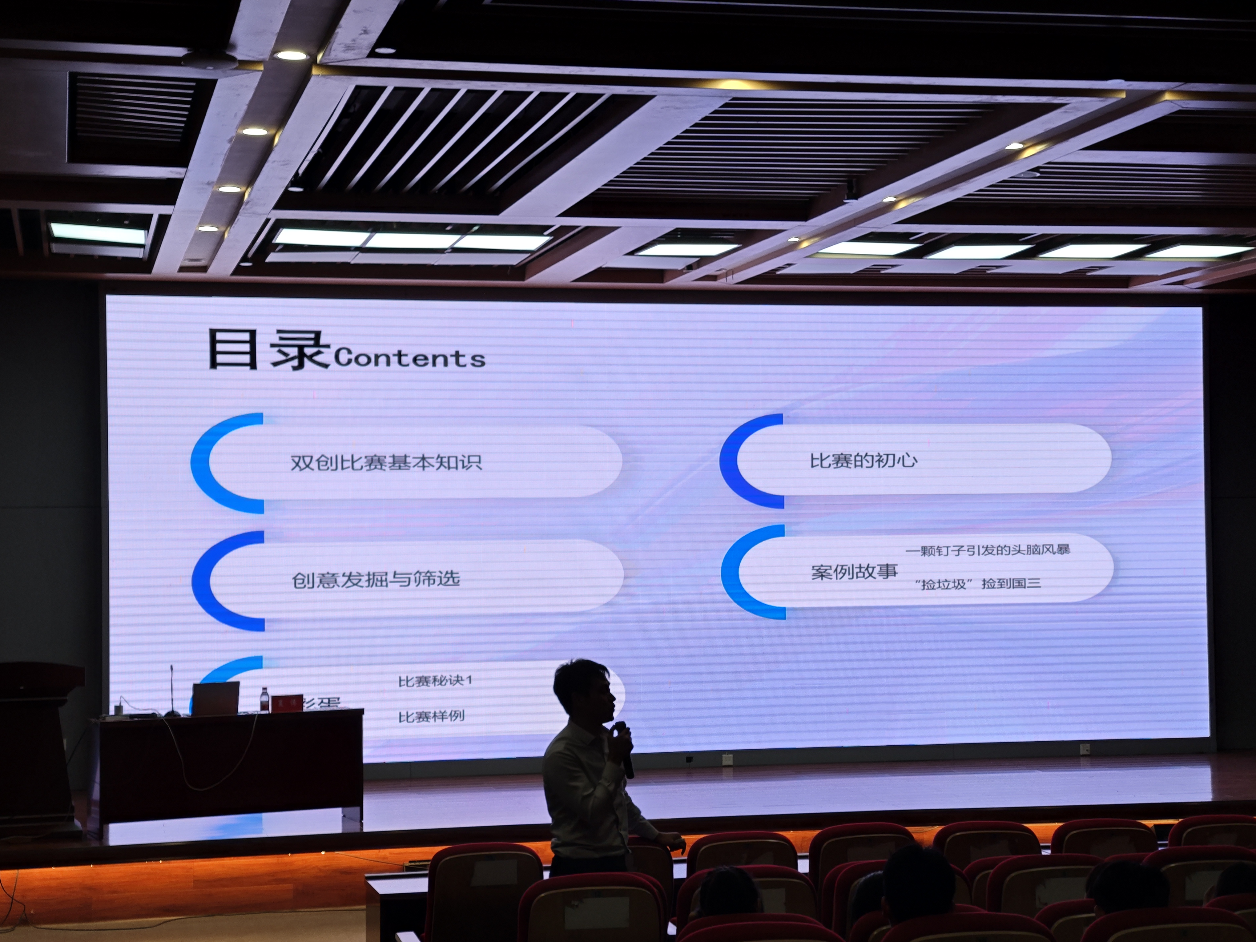 夏伟老师从双创比赛基本知识、比赛的初心、创意发掘与筛选、案例故事、比赛秘诀等方面展开讲授,详细阐述了是什么、为什么、怎么做的问题,给同学们指明了道路和方向。