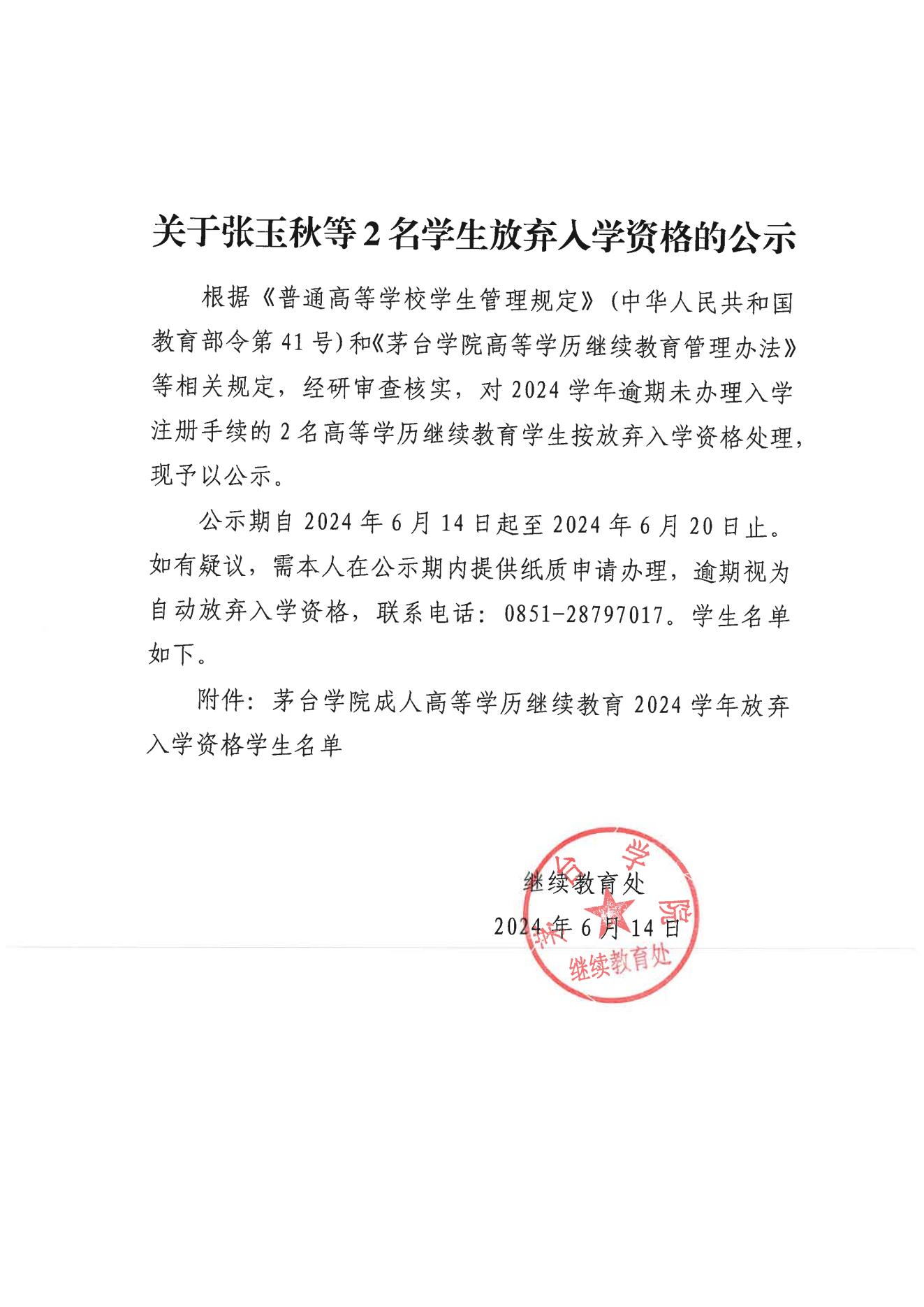 关于张玉秋等2名学生放弃入学资格的公示